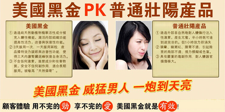 本藥吧為什麼會售賣美國黑金?因為目前使用美國黑金客人對美國黑金評價最接近日本藤素,美國黑金恰巧就是美國加利福尼亞州歐化大藥廠研製出來和日本藤素爭奪男性市場的壹款產品,但是美國黑金 日本藤素不同的地方在於,美國黑金效果側重的是對ED勃起功能障礙的針對性治療,日本藤素則更加側重於治療PE早洩,兩者出發點不用,終點壹致,在美國黑金上市以來,美國黑金收穫的評價也是數不勝數,ptt上分享美國黑金的po文到處都是,美國黑金在莊嚴藥市場中收穫了超過壹百萬的粉絲。美國黑金已被美國FDA檢測中心檢測,並通過認定為成年男士放心服用的壯陽佳品。現已經遠銷世界各國,深受各界人士壹致認可。