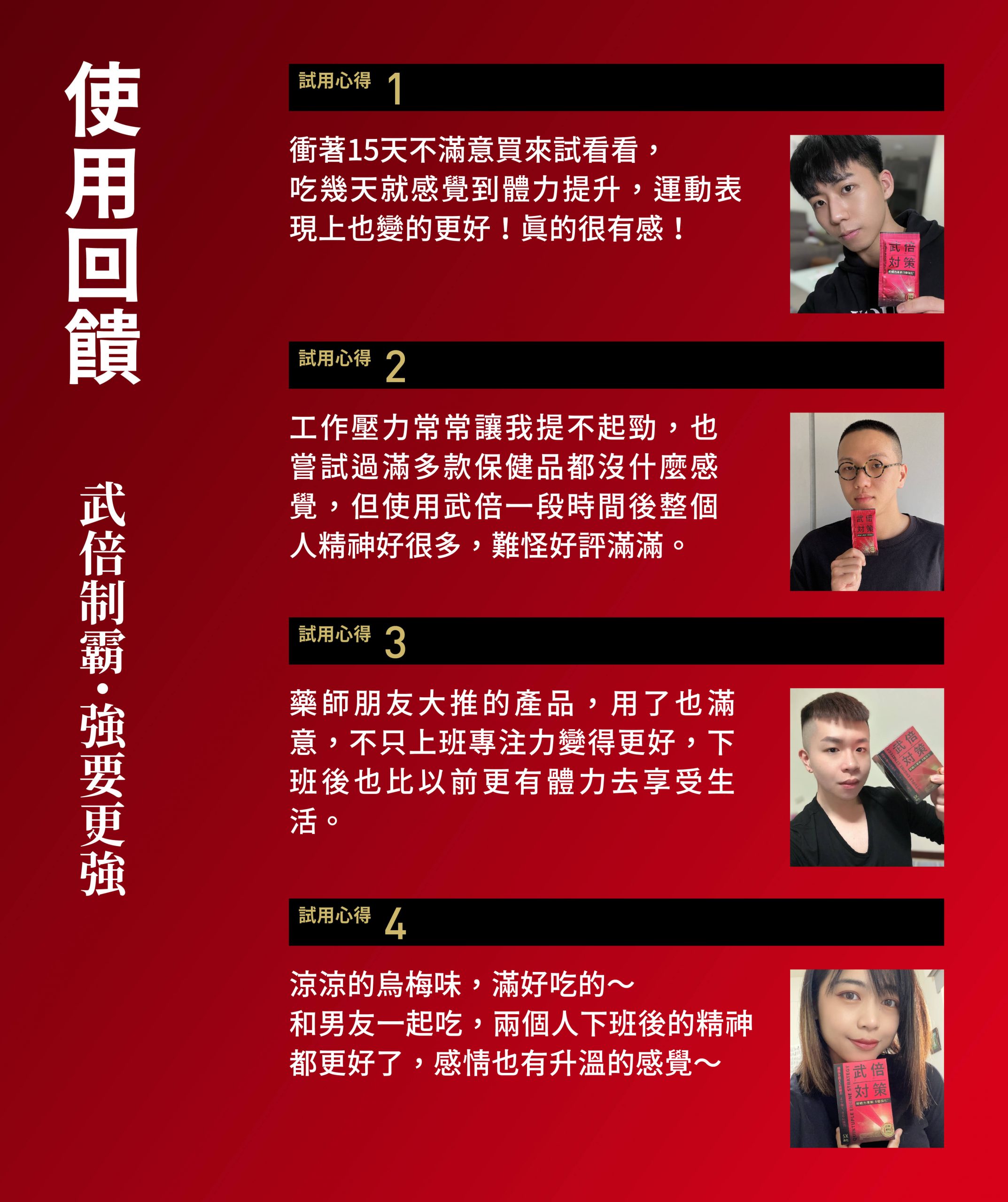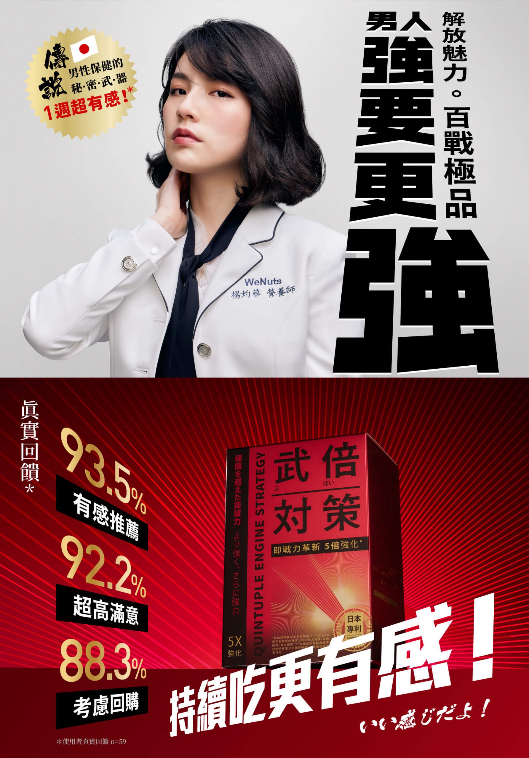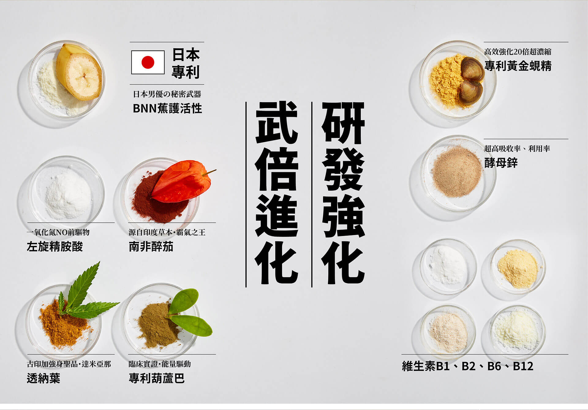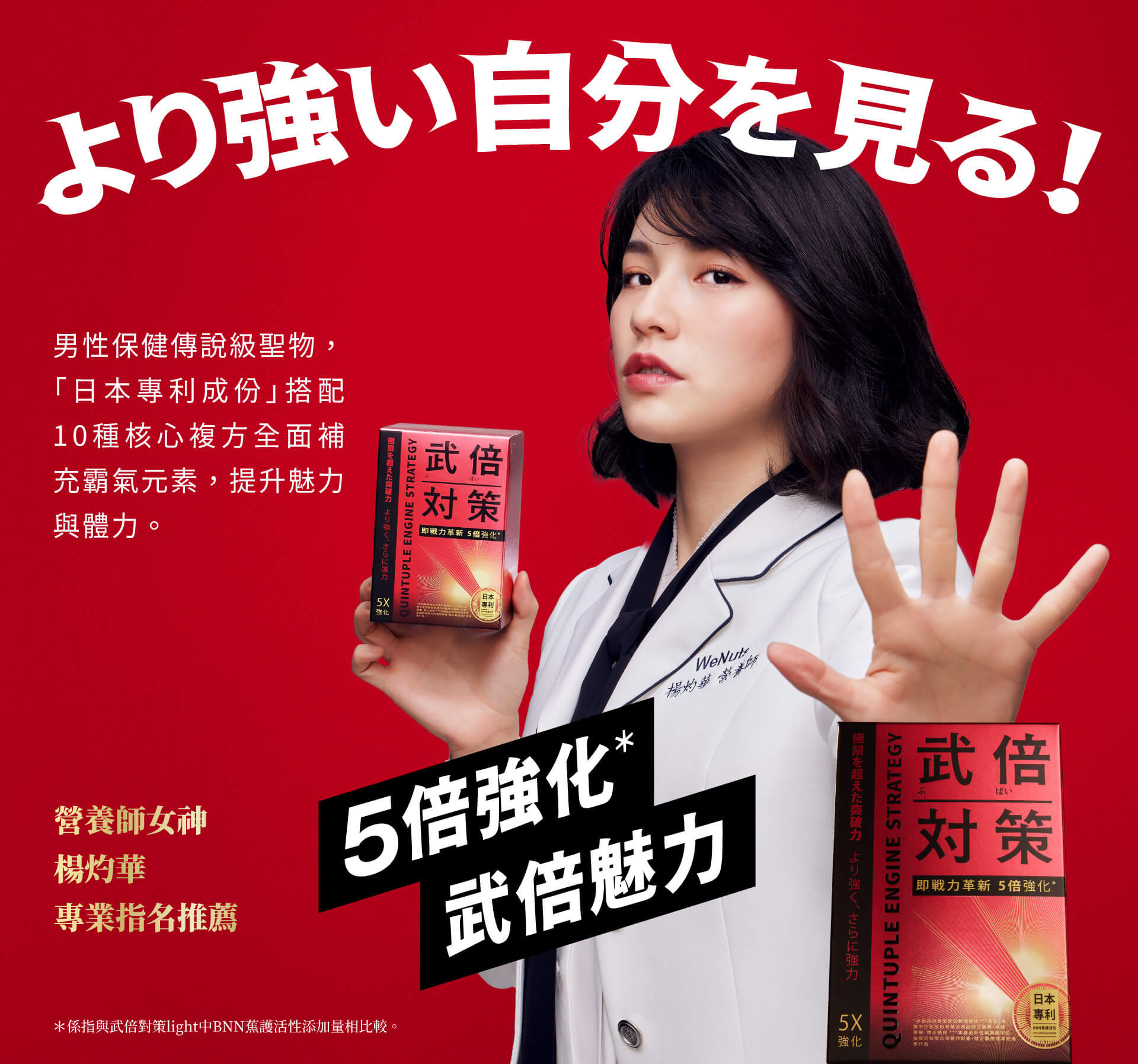 要讓魅力如影隨形,選擇武倍對策,讓你在生活的每一個瞬間,都充滿自信與活力。這款產品以日本專利技術為基礎,結合BNN蕉護活性精氨酸、透納葉和瑪卡等天然成分,能有效提升男性的體力和魅力,強化5倍,為你帶來前所未有的卓越表現。