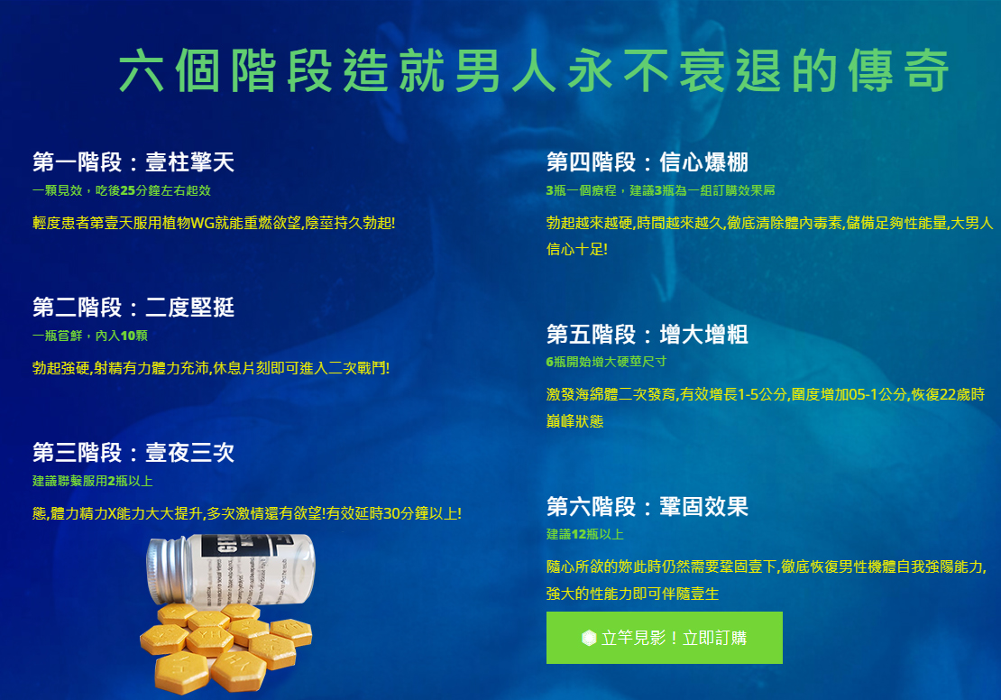 第一階段:壹柱擎天 一顆見效,吃後25分鐘左右起效 輕度患者第壹天服用植物WG就能重燃欲望,陰莖持久勃起!