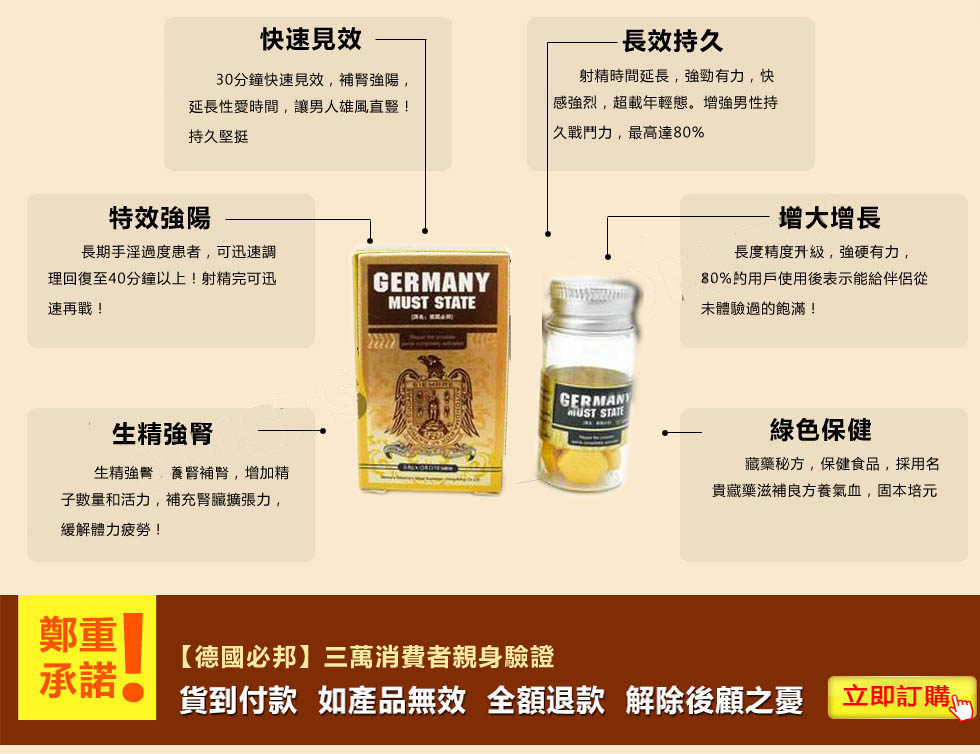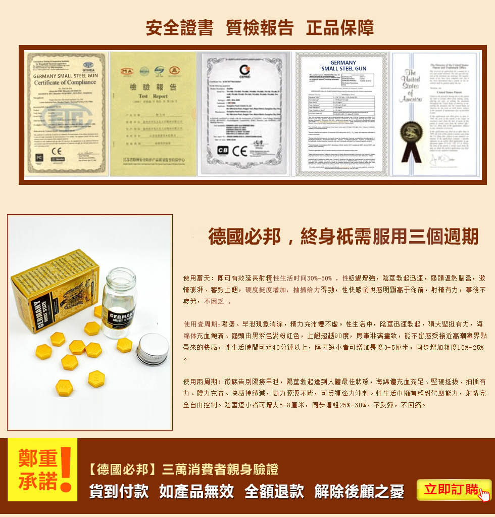德國必邦于2013在美國上市販售,一上市就獲得超強超好效果的高度評價!經過多年年的市場開拓與臨床試驗,德國必邦中「靶向活性肽」針對男性陽痿 不舉症狀、早洩不持久、陰莖短小的男性有特效,故在2016在台灣地區成立進入大樹藥局販售,請認準本網『』是台灣唯一正品販賣中心!