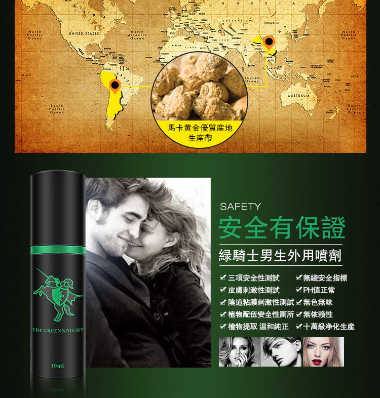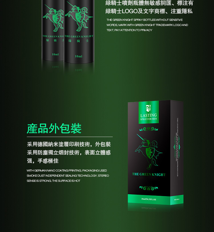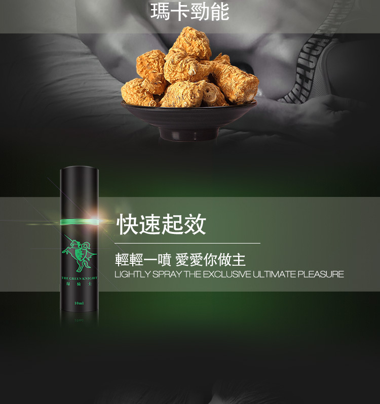 渴望在親密時刻展現更持久的愛意?綠騎士法國持久液是您的理想選擇。一噴即可喚醒激情,延長共享的甜蜜時光。本產品精選天然植物精華,迅速吸收並釋放其力效,助力克服性愛短暫的困擾,讓您與伴侶更加親近。