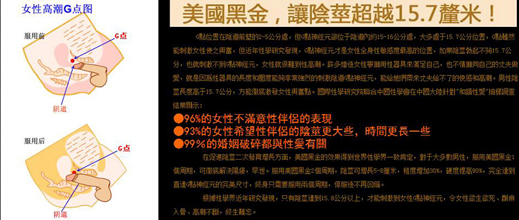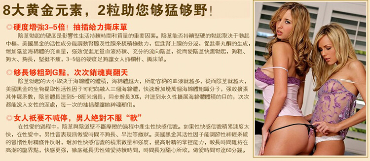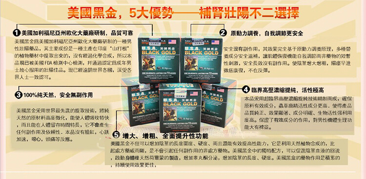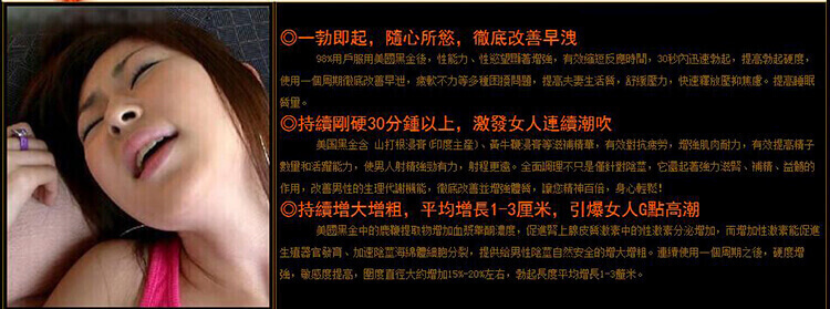 美國黑金功效特點:勃起迅速,威猛持久(高血壓,心臟病輕者,酒後均可服用) 身體有明顯改善,受損的組織單元細胞被修復。而且美國黑金是純動植物的成分使得美國黑金副作用極其微弱。