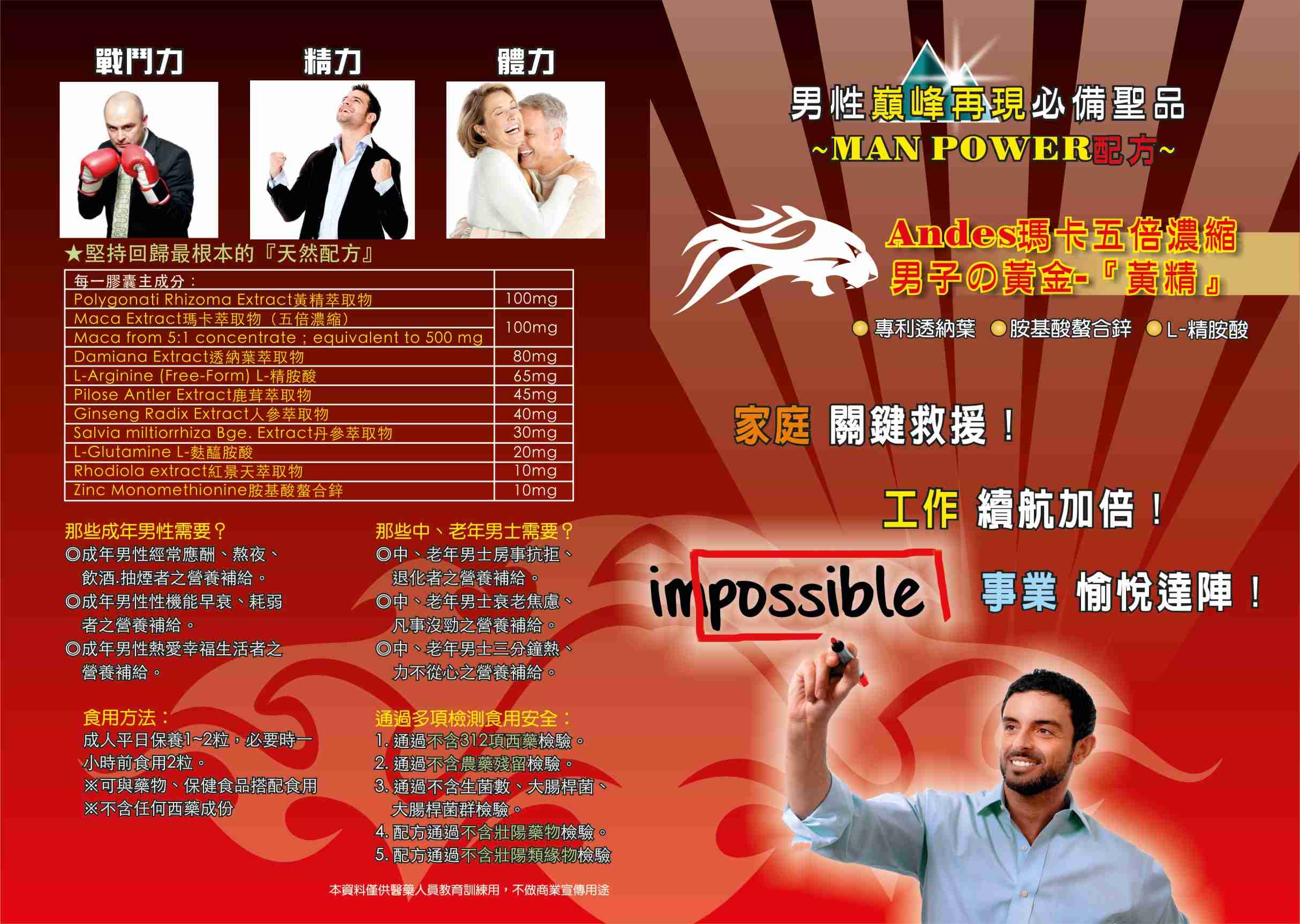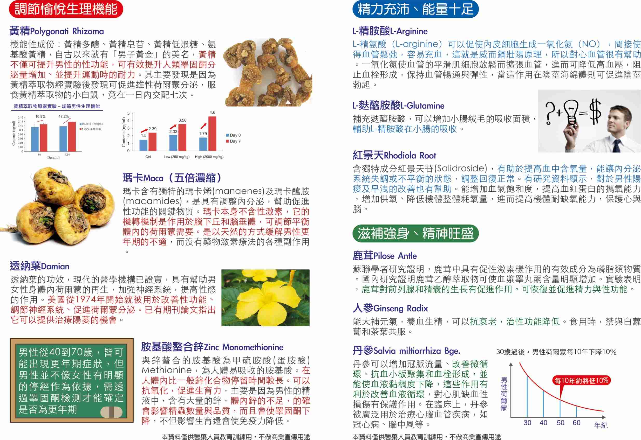 藥品成分:黃精萃取物、瑪卡萃取物、透納葉萃取物、L-精氨酸、鹿茸萃取物、人參萃取物、丹參萃取物、紅景天萃取物、單甲硫胺酸鋅