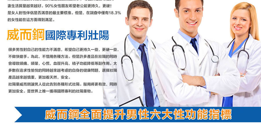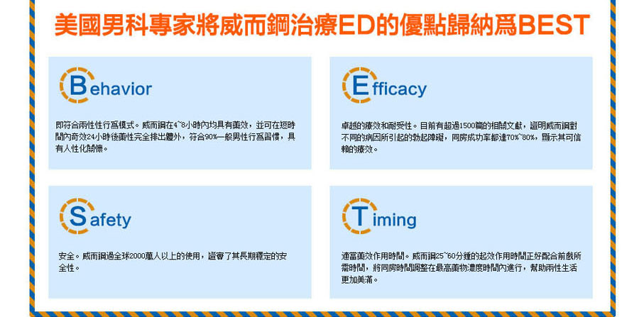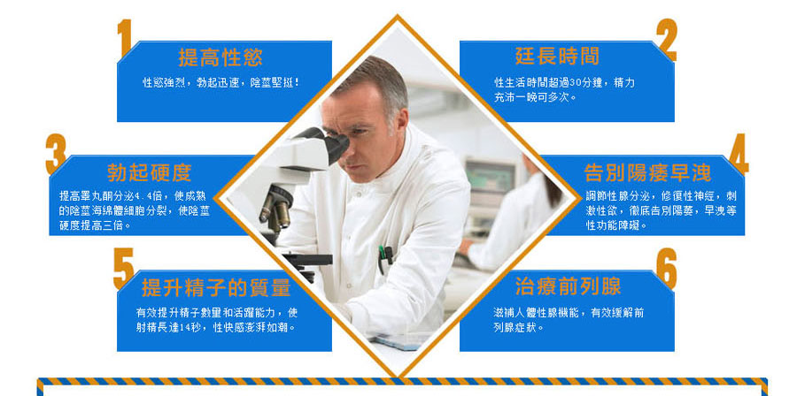 適應症:用於治療男性性功能障礙,包括勃起功能障礙(ED)與早洩(PE)。