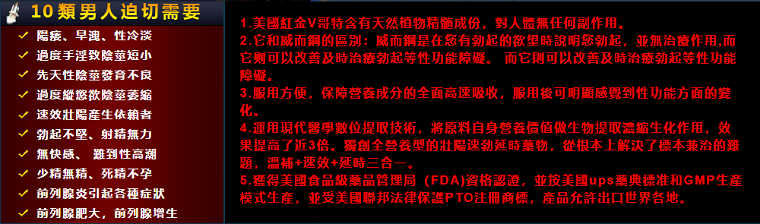 紅金偉哥自上市以來憑藉持久穩定的效果與良好口碑,在全球男性補益市場中迅速竄紅。其主要特色包括: