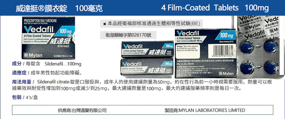 威達挺 Vedafil 100mg 助勃膜衣錠 4顆裝丨Sildenafil 強效持久