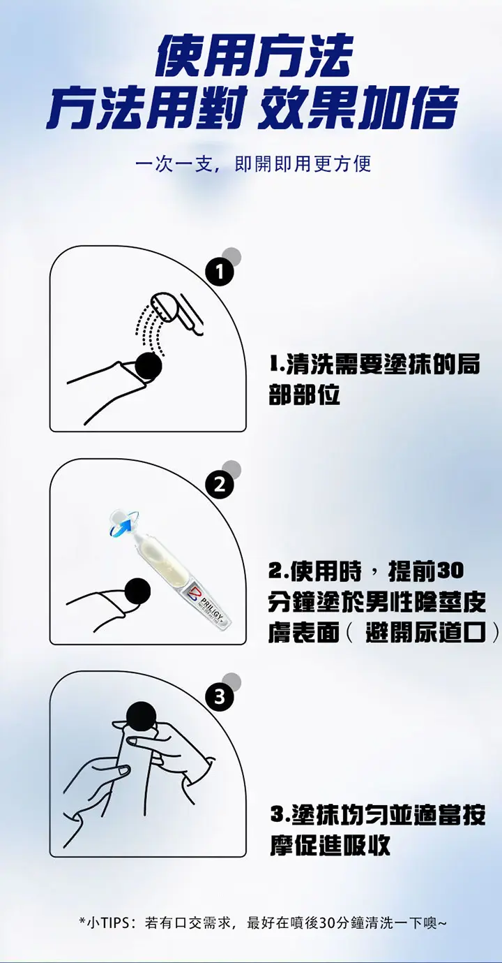 撕開一支(1ML),均勻塗抹於敏感部位(龜頭、冠狀溝附近)。不需要整根都塗,重點部位薄薄一層就夠。