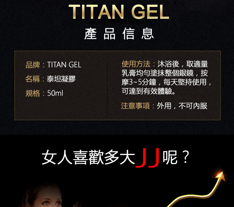 「工作壓力大到床上表現越來越差,老婆雖然沒說但我自己知道不行。用了 Titan Gel 兩個月,硬度真的有差,從軟趴趴變成有彈性那種感覺,而且以前 3 分鐘就繳械,現在可以撐到 10 幾分鐘。尺寸也有增加一點,雖然不到廣告說的那麼誇張,但確實有感。重點是老婆開始主動了,這才是最爽的!」