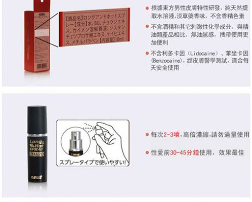| 用法用量 | 房事前 30~40 分鐘,於敏感部位噴 1~2 下,均勻塗抹待吸收 |